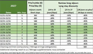Remises importantes pour les longs séjours (3, 4 semaines ou plus...).